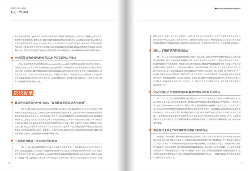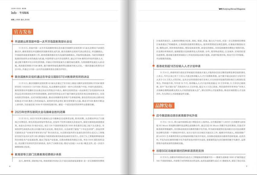 为一本以留学为核心内容的杂志,杂志关注国内外各大院校的动态信息,包括招生政策、院校排名变化、学术研究成果等,为留学生和有意愿留学的学生提供最新的院校信息,帮助他们做出明智的选择。留学政策是一个经常变动的领域,直接影响着留学生的留学选择和留学生活,杂志会对政策的变化进行深入解读和分析,为留学生提供相关信息,帮助他们适应政策变化,做出正确的决策。
