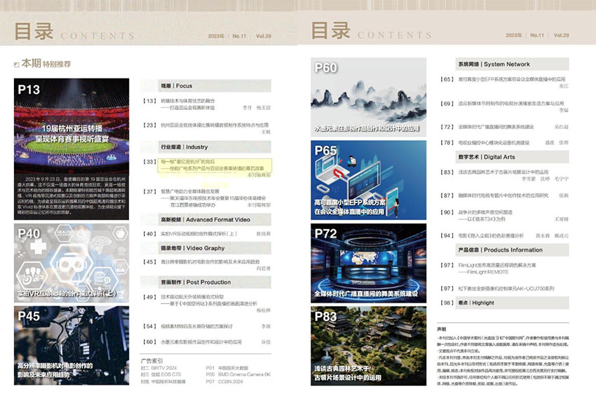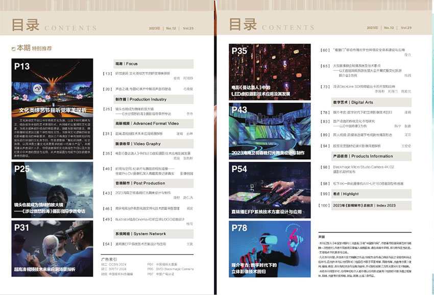 该杂志介绍影视制作的基本流程,包括剧本创作、拍摄、后期制作、音效等环节,介绍各种影视制作的技术手段和工具,如摄影技巧、特效制作、音频处理等;报道影视行业内的最新趋势和动态,包括电影市场的发展、影视创作的热点话题、名导名片的制作过程等,帮助读者了解影视行业的发展脉络;逐步分析一部电影或电视剧的制作过程,包括选题、策划、拍摄、后期制作等各个环节的细节,展示出一个影视作品是如何从无到有,从构思到落地的。