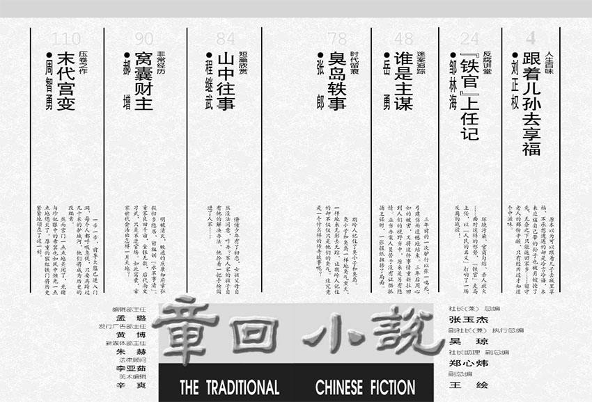《章回小说》杂志是一份以弘扬民族文化、繁荣中国气派的小说创作为宗旨的文艺期刊。它致力于为广大读者提供优秀的文化精神产品,通过精心策划和筛选,向读者呈现了一系列高质量的小说作品。该杂志始终坚持作品的高品位,力求在艺术性、趣味性、知识性和可读性之间达到高度统一。每一篇作品都经过严格筛选,确保内容精彩、文笔优美,能够给读者带来深刻的阅读体验。同时,杂志还注重挖掘和培养新人新作,为年轻作家提供展示才华的平台,促进了文学创作的繁荣和发展。杂志不仅在国内期刊界享有一定的知名度,还深受广大读者的好评,以“新奇精美,一读难忘”之美誉,吸引了众多文学爱好者的关注和喜爱。